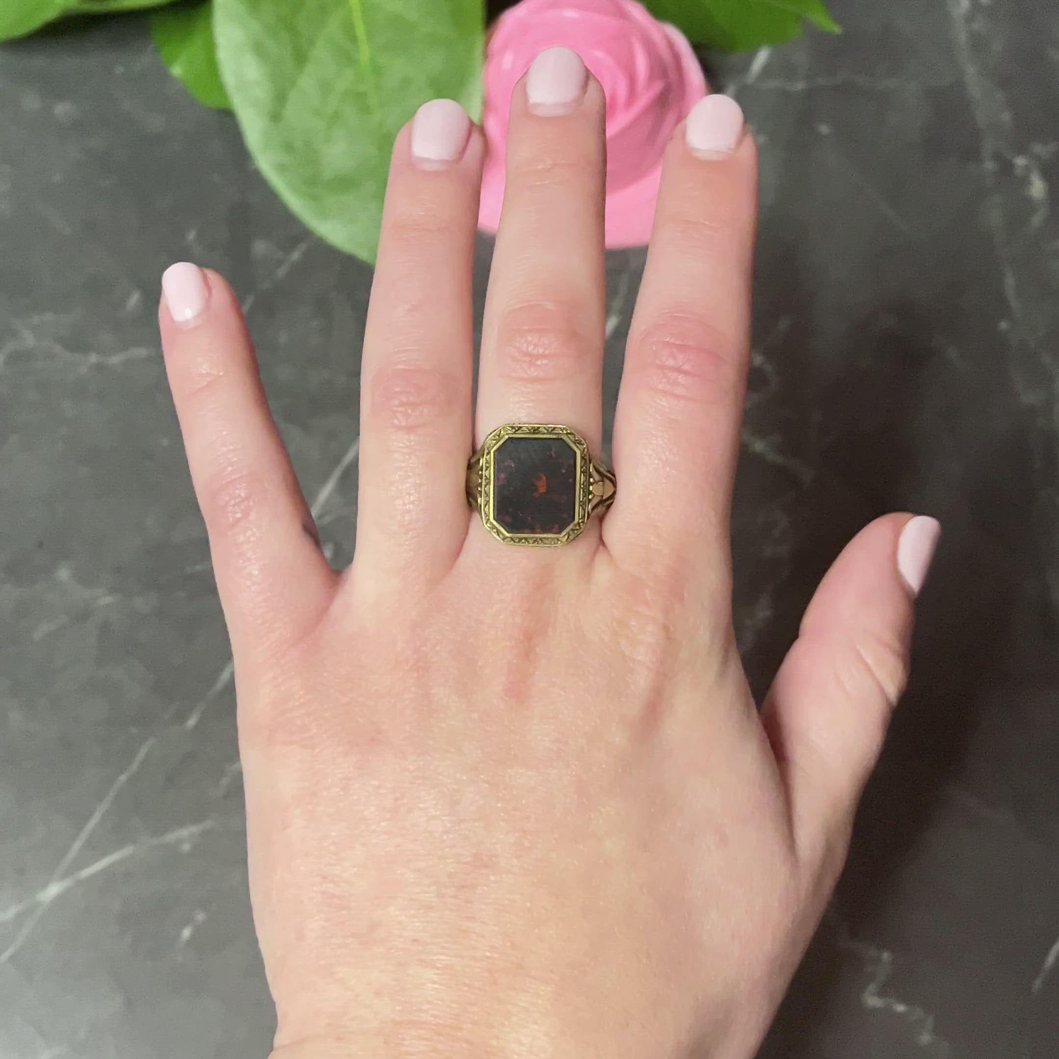 Art Deco 1930's Bloodstone 14 Karat Gold Lotus Unisex Signet Ring