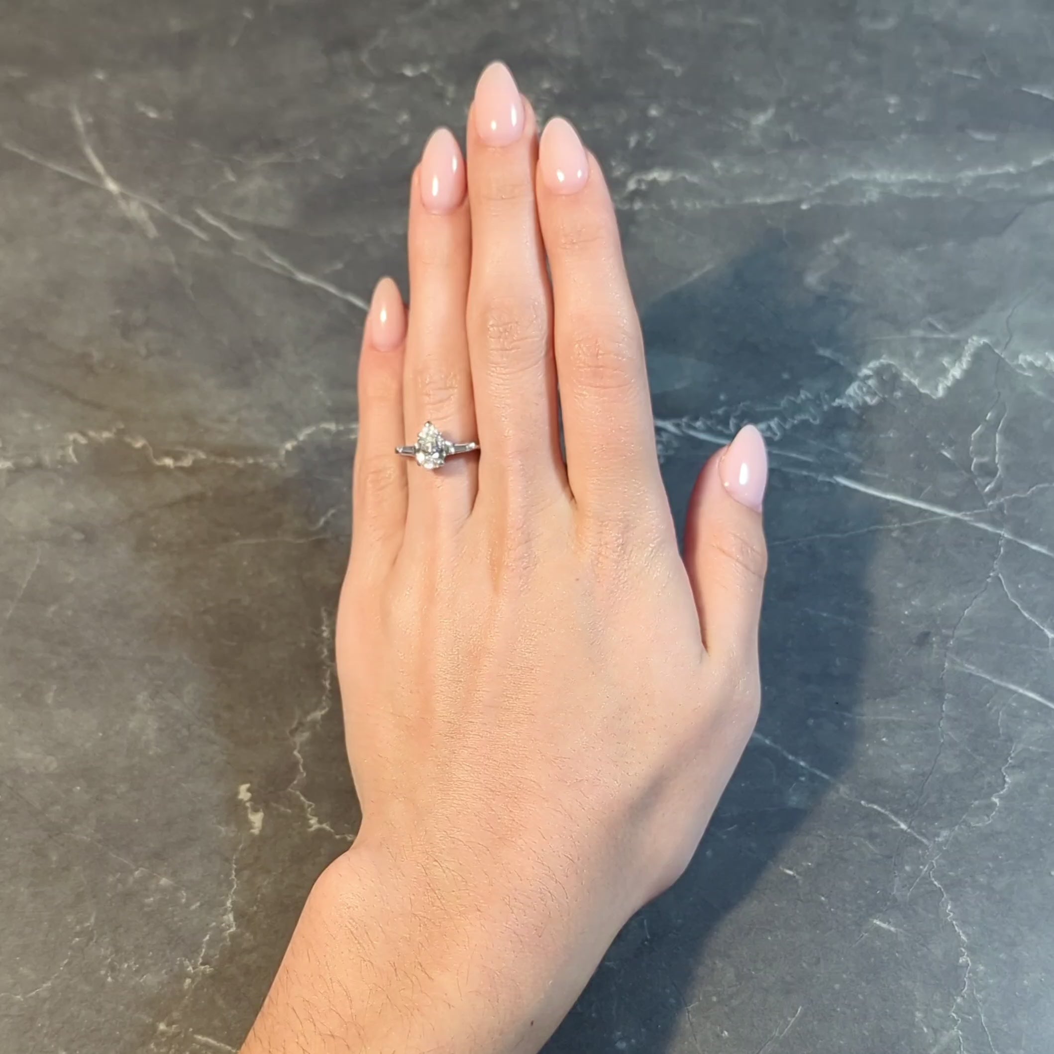 - Three stone ring centers a pear cut diamond weighing 1.16 carats with H color and VS1 clarity