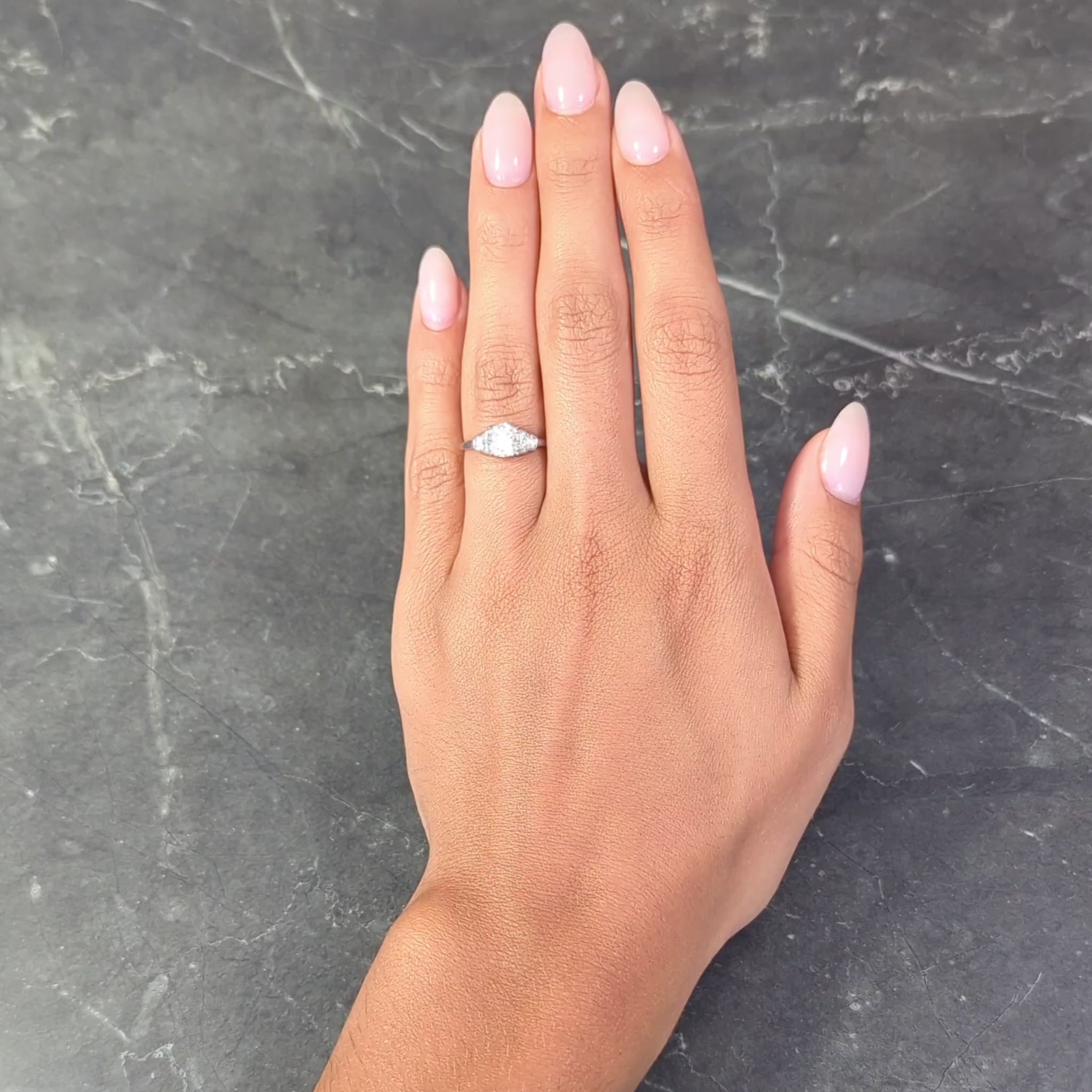 - Set in a basket with tri-split prongs and flanked by cathedral shoulders