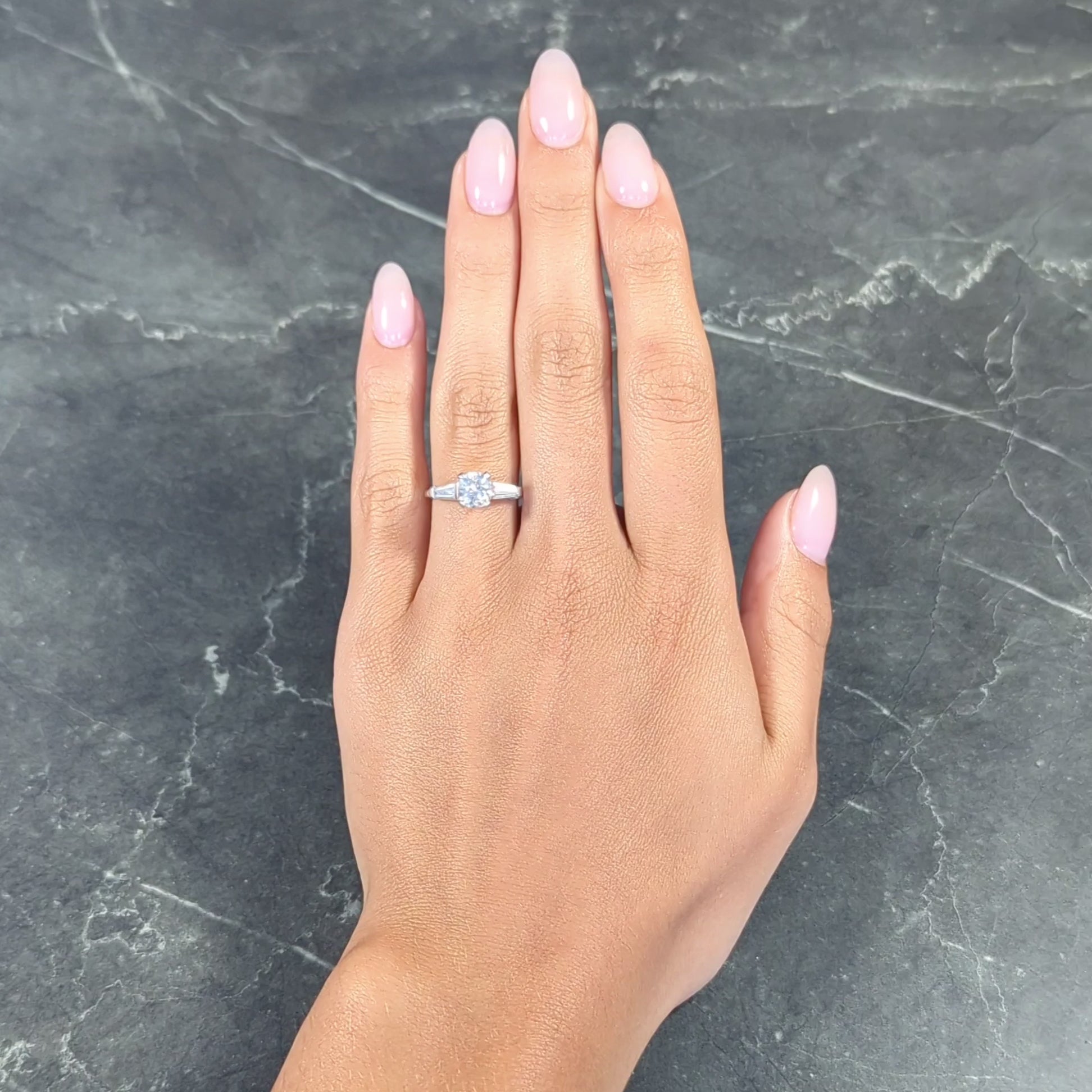 - Prong set in a basket and flanked by tapered baguette-cut diamonds