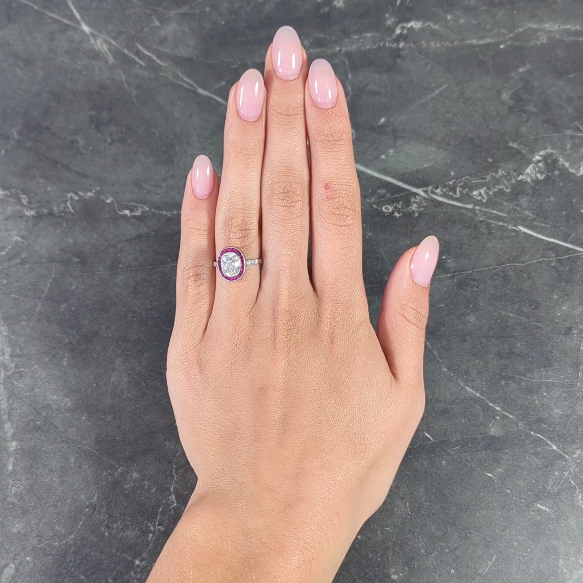 Expertly crafted in platinum, the ring showcases the mesmerizing combination of old mine-cut diamonds and vibrant rubies. The halo design and intricate detailing evoke the spirit of Art Deco motifs, exuding an air of elegance and enduring style while embracing 90s fashion!